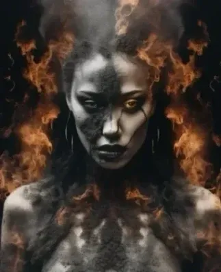 Фотография с двойной маскировкой, разгневанная богиня, образовавшаяся из дыма, богиня Земля плачет, черный дым, огонь, кислотный дождь, негативное пространство, сложные детали, фотоиллюстрация, объектив 100 мм, кинематографические сцены