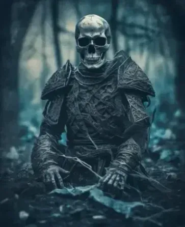 Мужчина-Воин Хаоса, черепа на земле, Стекло, Полигон, ультра детализированный, замысловатый, 8k, темный, динамичное действие, снятый на цианотипию, треснувшая линза, мечтательная ностальгия, мягкий фокус, темный виньетирование, утечки света, средняя фотография, мрачная художественная живописно-неземная, крупнозернистая фотография