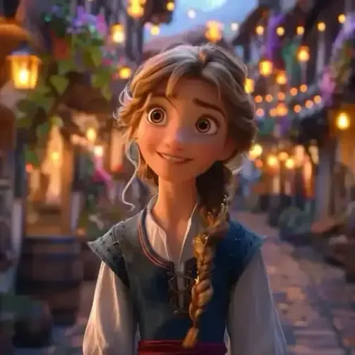 Пожалуйста, создайте портерет женщины. Фон может быть сказочным и красочным, дополняющим волшебную атмосферу Дисней. Человек с мягкими чертами и выразительными глазами, плавными линиями