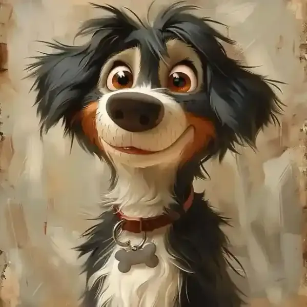 Пожалуйста, создайте портерет собаки. Фон может быть сказочным и красочным, дополняющим волшебную атмосферу Дисней. Человек с мягкими чертами и выразительными глазами, плавными линиями