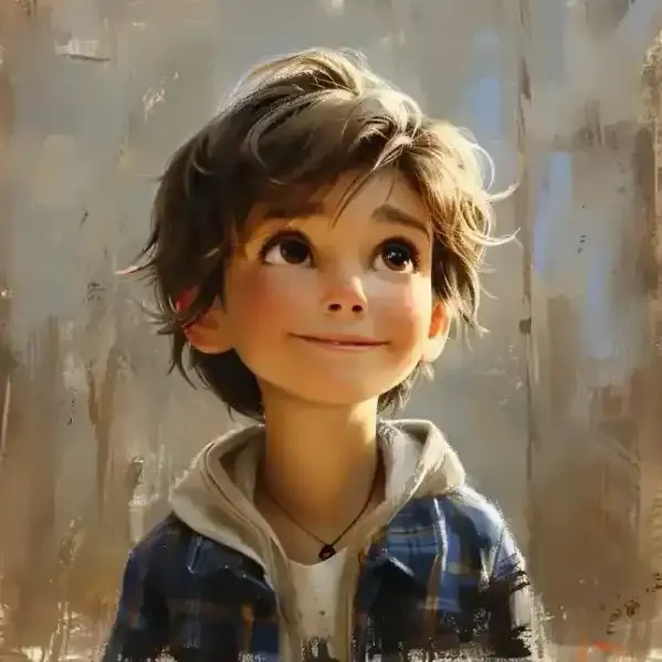 Пожалуйста, создайте портерет ребнка. Фон может быть сказочным и красочным, дополняющим волшебную атмосферу Дисней. Человек с мягкими чертами и выразительными глазами, плавными линиями