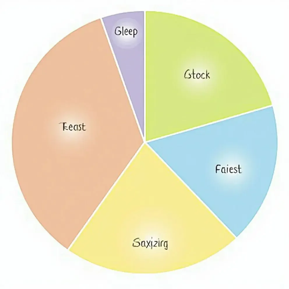 Круговая диаграмма: Сгенерируйте круговую диаграмму, показывающую распределение времени, которое человек тратит на разные виды деятельности в течение дня: сон, работу, питание, отдых и другие занятия. Используйте яркие цвета для каждого сегмента и добавьте легенду.