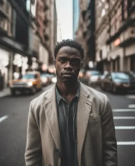 Чернокожий мужчина, в городе, треснувшая линза, мечтательная ностальгия, мягкий фокус, сложные детали, портретная фотография, сверхширокий угол, глубина резкости, сверхдетализация.