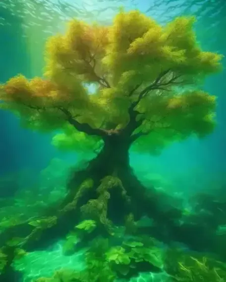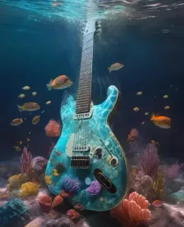 Завораживающее изображение электрогитары, погруженной под воду, вокруг которой поднимаются пузырьки. Это изображение, вдохновленное подводным фэнтези, которое демонстрирует красоту гитары в необычной обстановке. Окружающая среда/фон должен представлять собой подводный мир с красочными коралловыми рифами