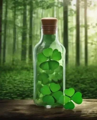 Фотореалистичное изображение бутылки с водой, наполненной листьями клевера, на фоне густого лес